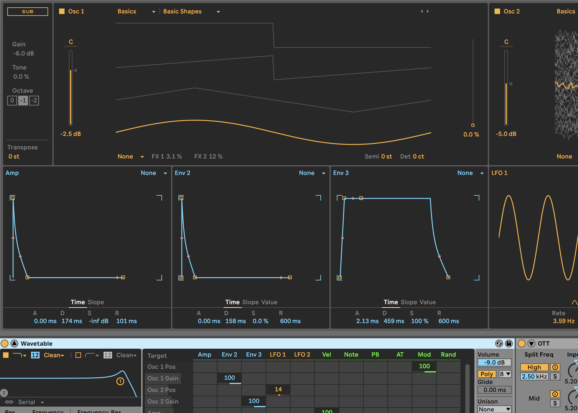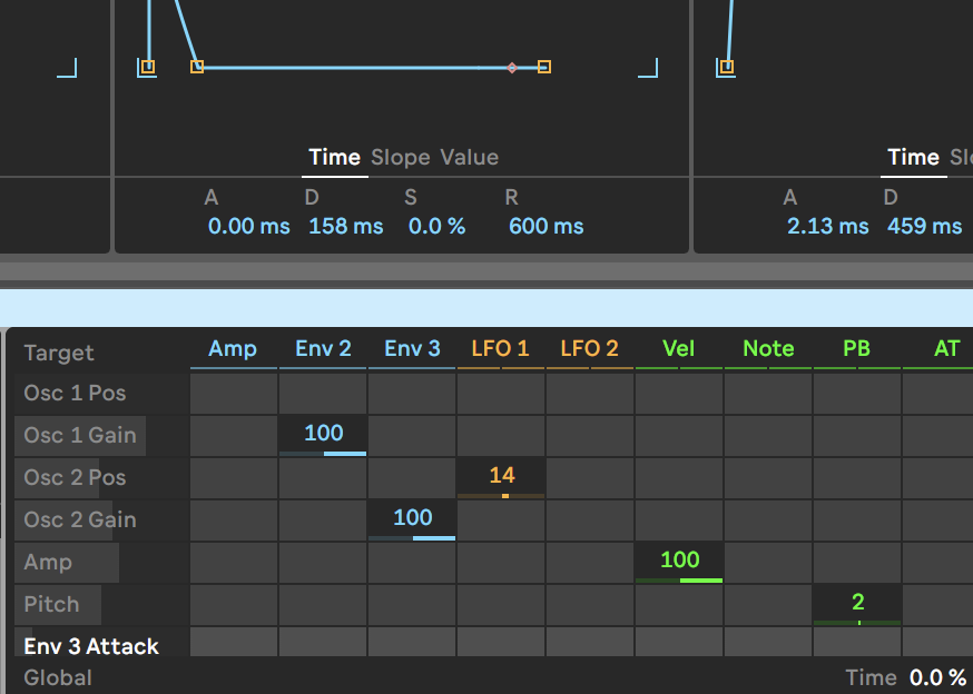 This is because with the wavetable, the waveform must be actively swept to sound like usual noise. So we connect LFO 1 with Osc 2 Pos with 15% intensity and set the basic position to 50% with the slider to the right of the waveform. If you want to change the sound of the snare later, you should start at exactly this modulation.