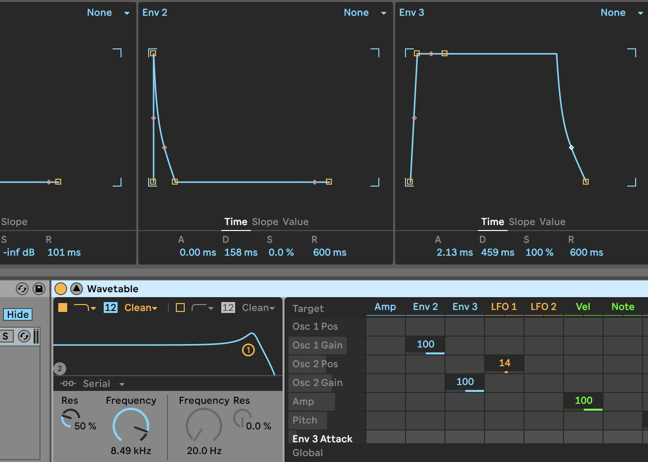 To avoid overlap of the Rimshot and Noise, we combine Env 2 with Osc 2 Gain and set the envelope attack to 2 ms and sustain to 100%. In the filter section, we activate the Clean 12 dB lowpass and set Frequency to 8.5 kHz and Res(onance) to 50%. This is much closer to the original. With this, the basic sound is already created.