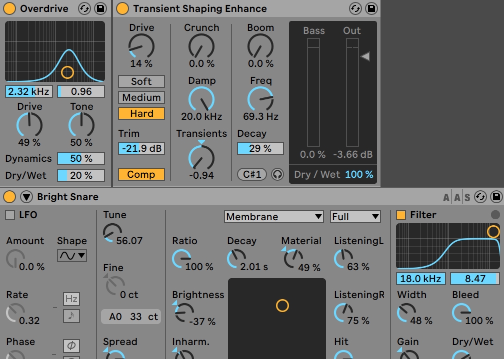 For our final polish, we load the following effects: Overdrive with Center Frequency at 2.3 kHz and Bandwidth at 0.96 for a rougher sound. After that, Corpus with the Bright Snare Preset, which lives up to its name and results in a brighter snare. Next comes the Drum Buss with the Transient Shaping Enhance preset for more punch.