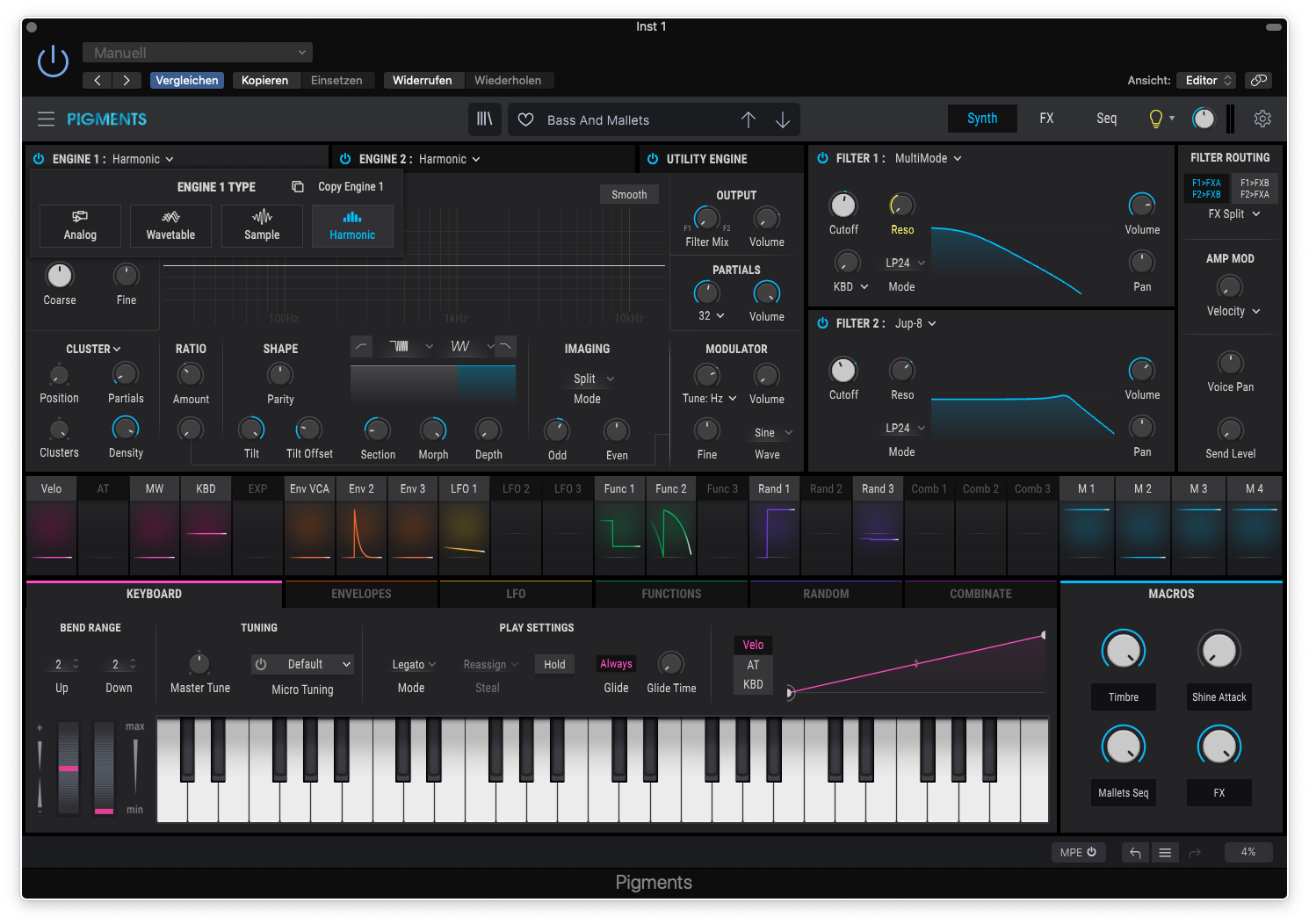 After Virtual Analog, Sampling, Wavetable and Granular, they’ve now added another engine: „Harmonic“ offers extensive additive synthesis with up to 512 partials and several options for shaping the overtone structure. Admittedly, this form of synthesis is not very popular, but the presets of „Pigments 3.0“ have their potential, which we demonstrate acoustically. I first get stuck on the „Intro Pad“ preset. With only one engine, it shows how individual partials cascade one after the other and how Additive Synthesis is capable of smooth undulations. Now you should turn on the inactive Engine 2 and add a piano sample to this preset. The preset with the appropriately named title „Harmonic Sweep“ offers something similar. Voil - these are two spherical, slightly pulsating sounds for which I appreciate Arturia Pigments (see sound demos „Intro Pad“ and „Harmonic Sweep“).