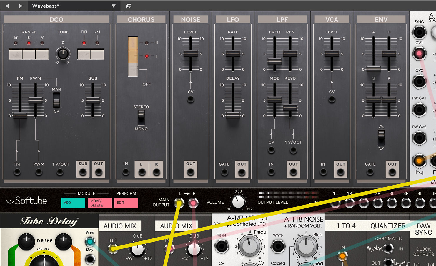 If you open the right panel, there are a few extensions to discover. Volume, filter frequency and even the pulse width can be modulated by keyboard expression, the latter in particular allows interesting variations when playing. Aftertouch can also affect these parameters. A spread parameter for detuning the voices against each other and a fixed phase for an identical starting point for all oscillators (for basses & kicks) have been added to the unison function. In Softube‘s Amp Room, the perfectly reproduced Juno chorus is available as a module, even with a stereo input! And if you own Softube Modular, you get six new modules for the virtual rack when you buy the Model 84.