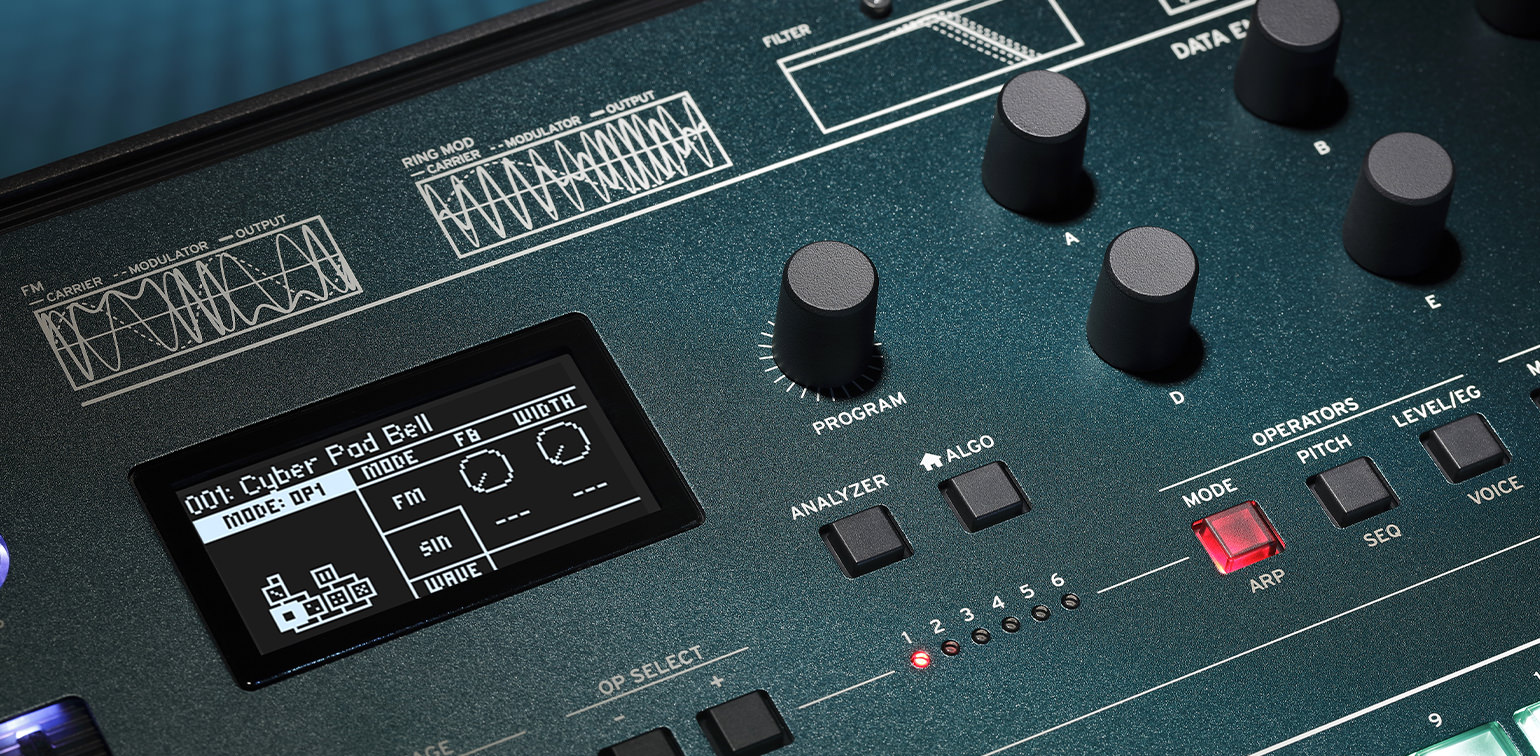 The sound synthesis in the opsix goes way beyond the DX7 and offers more waveforms per oscillator than just sine and also allows more combinations. 40 algorithms plus individual operator circuitry are available. The volumes of the modulators, which have a different effect than in analog synthesizers, are essential for their sonic results. If you modulate the volume of Operator 2 via an envelope in the example above, the modulation of Operator 1 follows this course. This is more reminiscent of a filter envelope than a volume envelope, since Operator 2 is not audible as a modulator. The same applies to the frequency ratio between carrier and operator. It decides between bell and bass, harmonic piano sound or disharmonic metal thunderstorm. And this complex interaction can be „grasped“ directly with the opsix in the double sense of the word, because you have direct access to these parameters for all six operators.