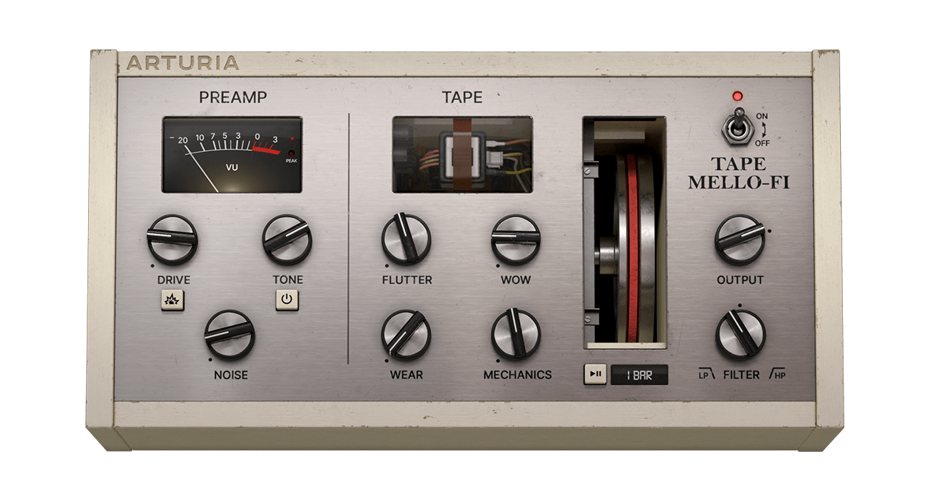 A collection of 25 presets is already included. Added are the Distortion and Boost controls to drive the signal into saturation. A low-pass and high-pass filter are included. Another highlight is the interactive tape wheel to enable creative tempo-synchronized tape stop effects.