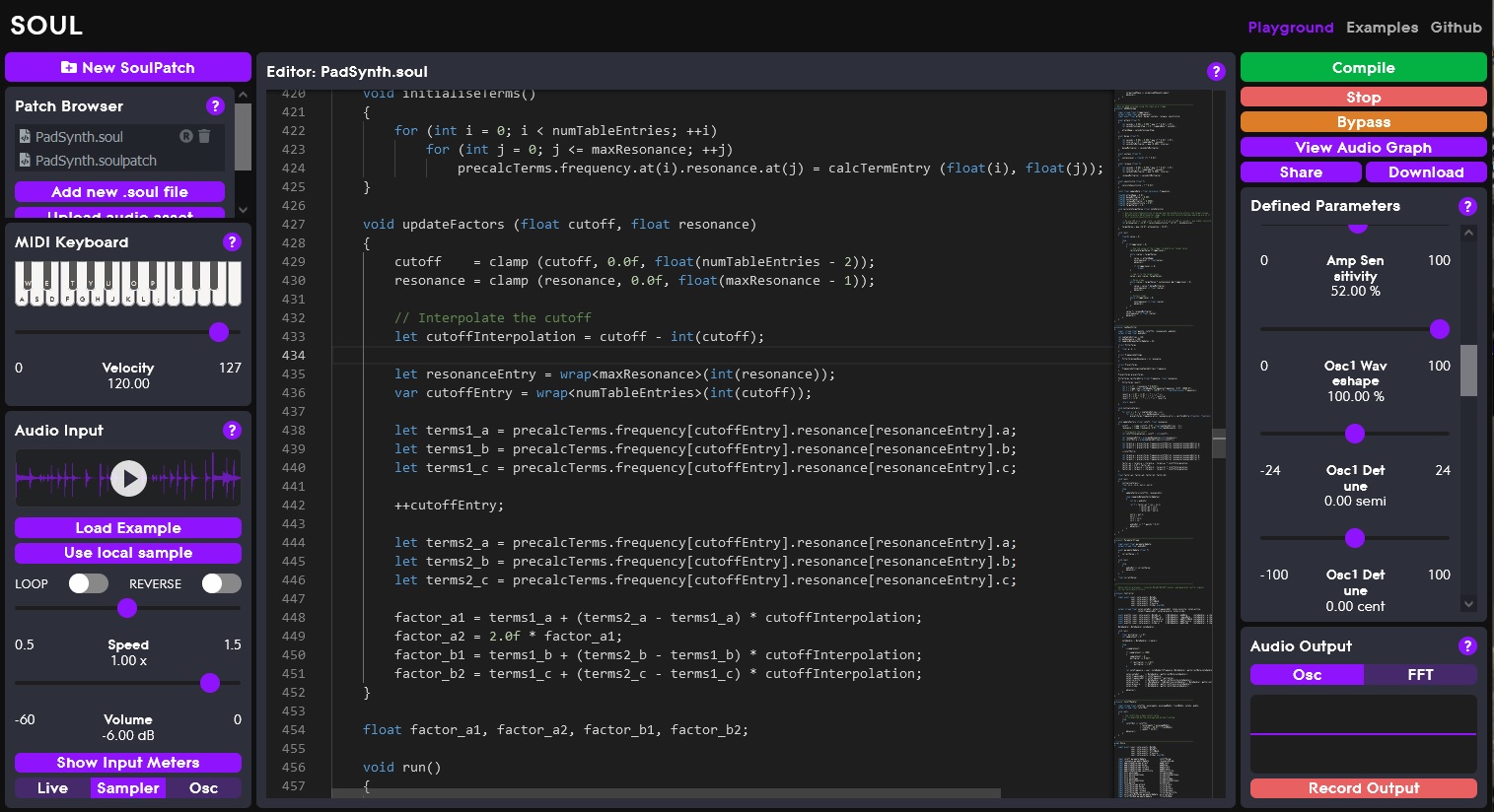 Programming takes place on the so-called Playground, where the program code is listed. Via Compile, an instrument can then be generated from the code, whose individual parameters such as volume, filter or envelope can be edited. A small MIDI keyboard can be used to play the object, if it is an instrument. Under Examples, various script examples are available for selection. SOUL opens up an innovative, playful way of coding new audio tools, which are still expandable, but definitely worth trying out.