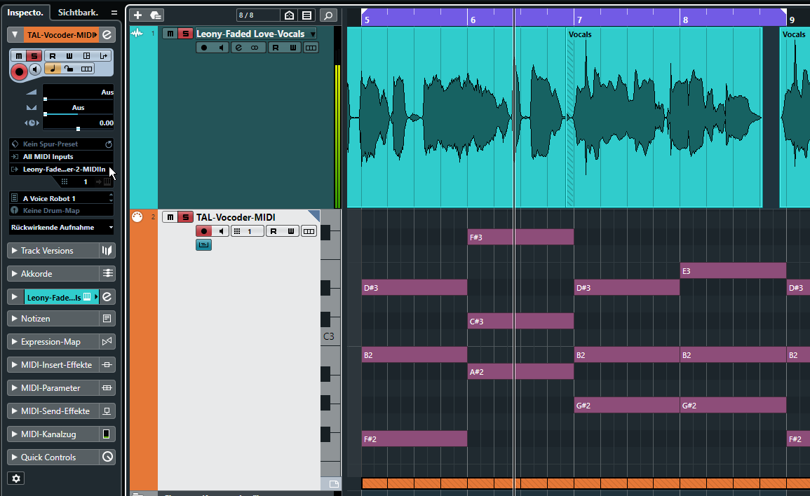 To give the vocals a more even level before processing with the vocoder, compression can be helpful. Alternatively, you can even out the level of individual syllables directly on the audio track. For a more lively sound, TAL-Vocoder comes with a good-sounding Chorus effect. Delay and reverb have also proved useful for refining the sound.