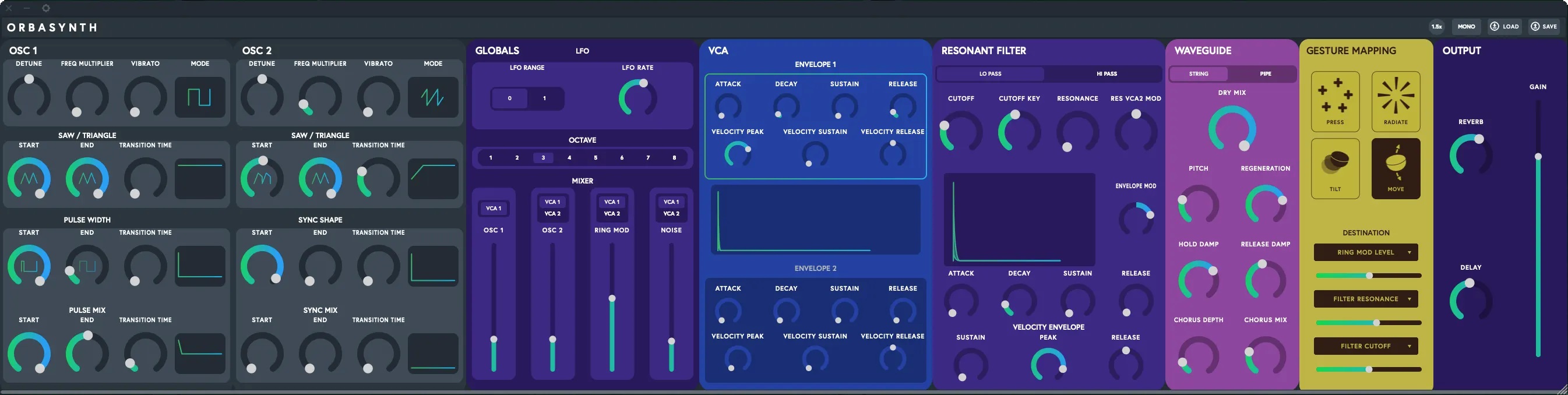 Between the waveforms Saw and Triangle In the mixer section, the oscillators, a noise generator plus ring modulator can be mixed. In addition, there is a VCA and a resonant filter module, each with its own envelope. For the creation of string and brass-like sounds, the Waveguide module helps. In addition, some reverb and delay can be added to the signal. Special attention is paid to the Gesture Mapping. Here you can define the type of gesture with Press, Radiate, Tilt and Move. It is possible to save presets.