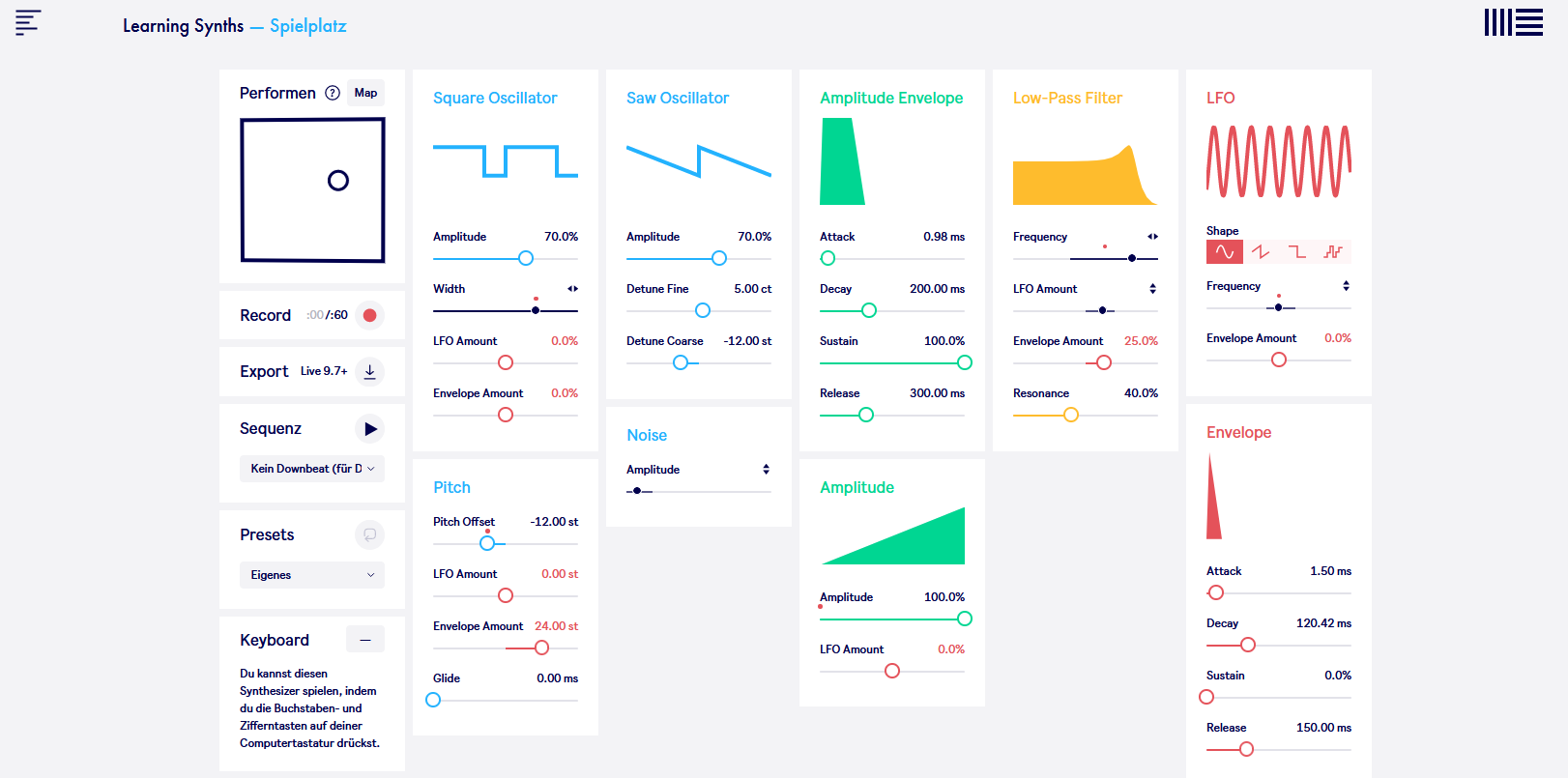 A monosynth serves as an example basis for the tutorial, on which the essential elements of a synthesizer can be explained, such as the two oscillators, the filter, envelopes and LFOs. The sound can be further edited in a live set via the export function. The project can be transferred from the browser to a Max for Live synth. Up to 60 seconds of audio recording is possible. For fast and surprising sound combinations the configurable XY-Pad is helpful to control 30 parameters. Turkish, Portuguese and Finnish are supported for the first time.