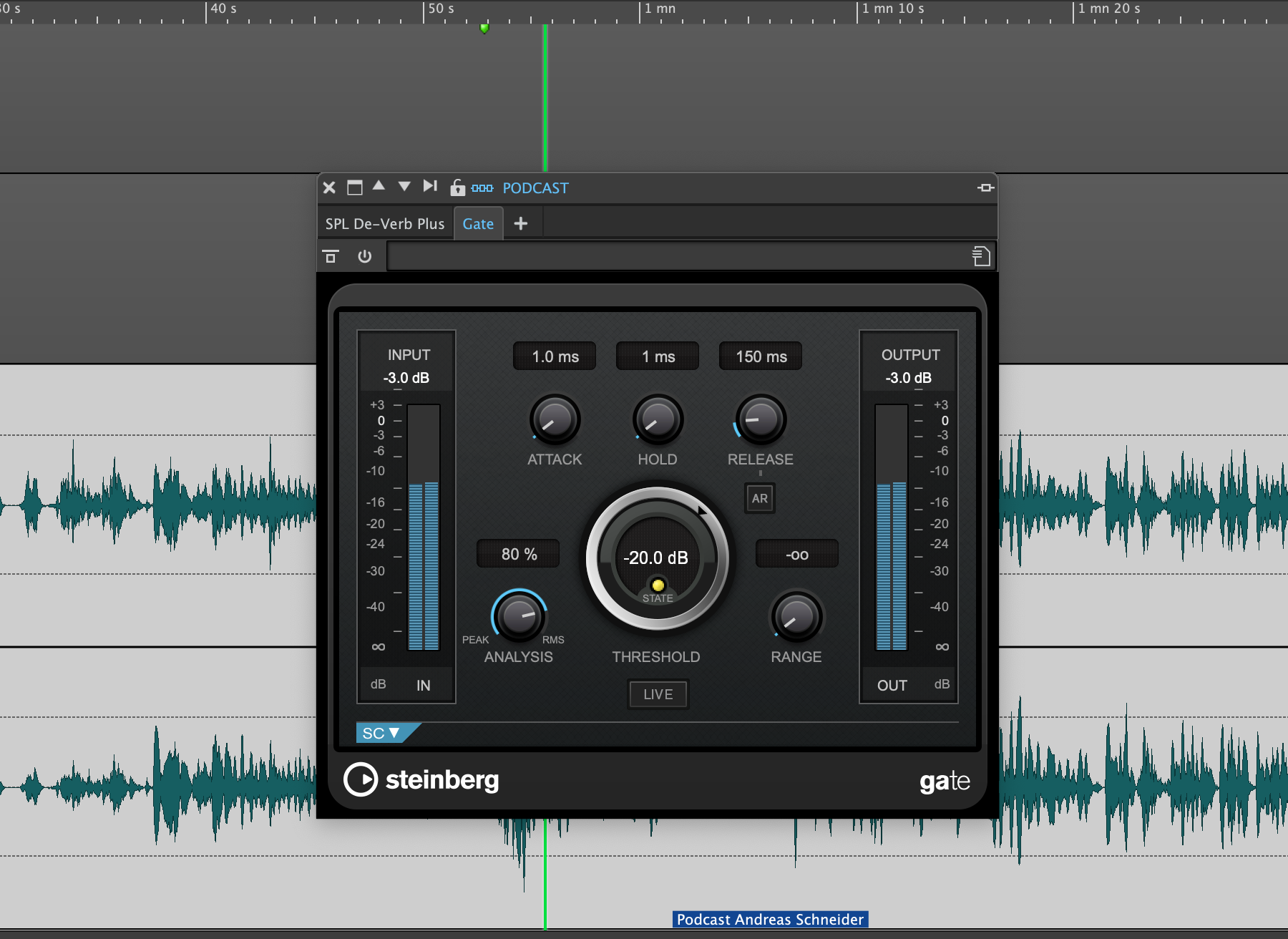 We emphasize „halfway“, because it won‘t be perfect with this solution. The ultimate heroes in this respect are SPL De-Verb and DeVerberate by Acon Digital, the latter being the ultimate specialist for perfectly removing even nasty reverberation, while extreme settings with De-Verb can lead to somewhat choppy speech.