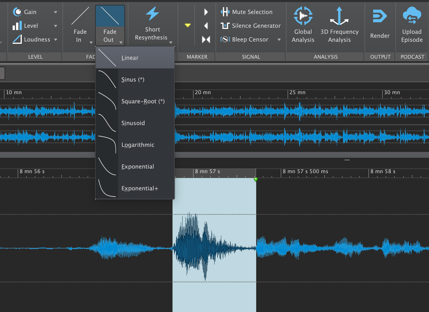 By the way, if cutting or reducing doesn‘t help, fades are also a possible solution: select the peak and let it fade out and put a short fade-in behind it. In some cases this helps more than cutting. Repeat these steps for all other peaks and interferers. You can also contain overly loud P and T sounds in the same way as peaks.