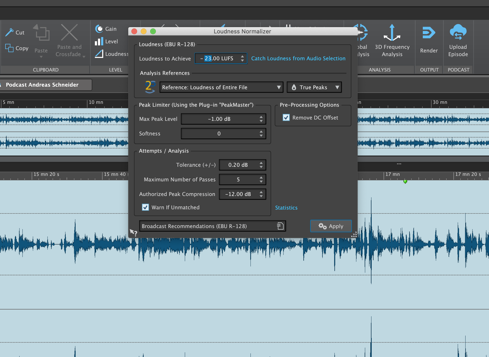 For S-louds, Wave Lab offers an effective tool. Before we use this live effect, however, we normalize the recording via the Loudness option when all peaks have been removed. As a Max Peak Level, -1 dB is a good value to keep some headroom. By the way, now is a good time to save the file.