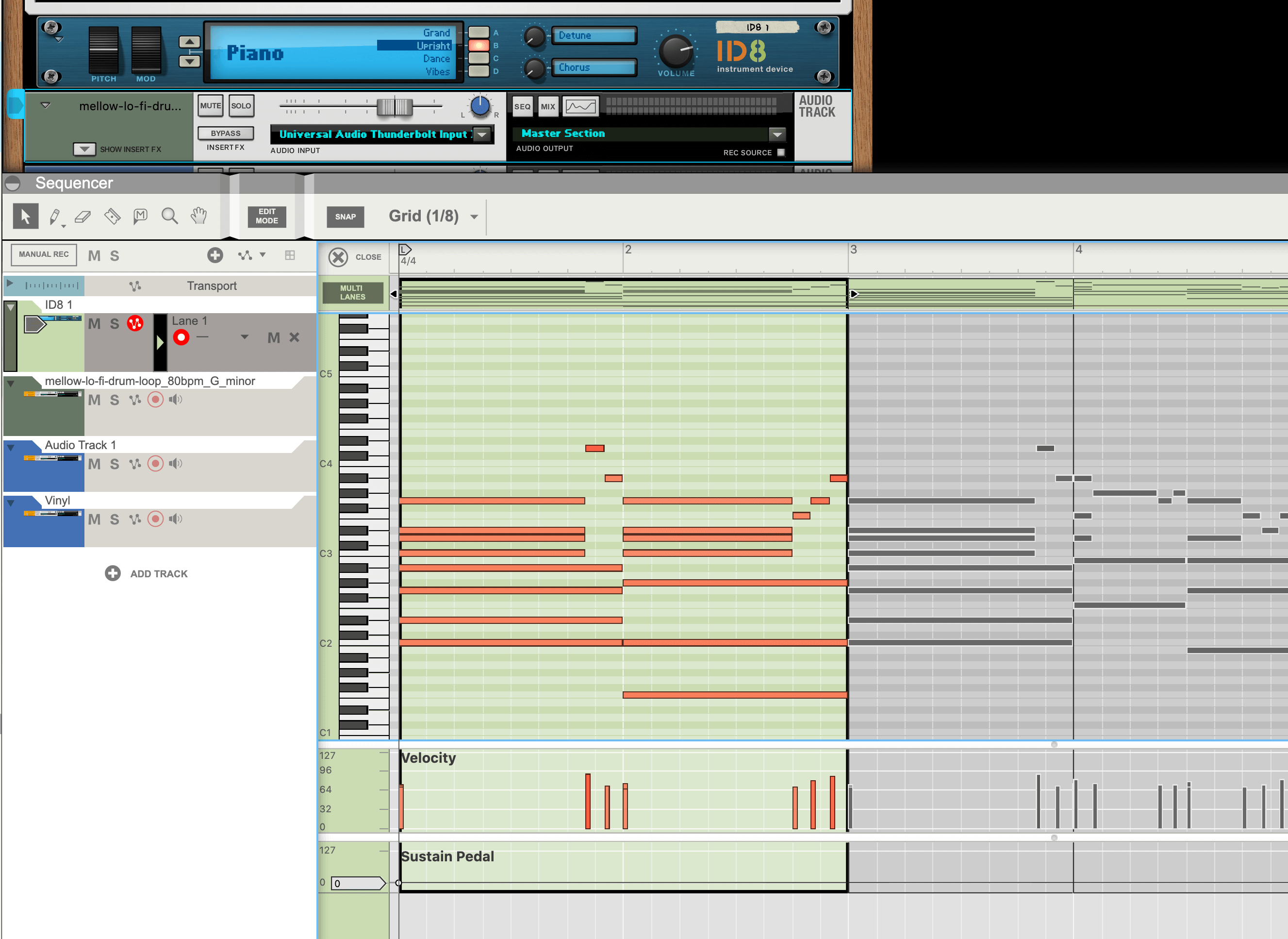 We start with a piano melody at 75 BPM, you can't go wrong with that. We use a simple piano from Reason's ID8-Rompler, but any other piano will do. And if – like us – you're not a keyboard virtuoso, you can help yourself to the LOFI PIANO MIDI FILES folder by Michael Kim-Sheng.