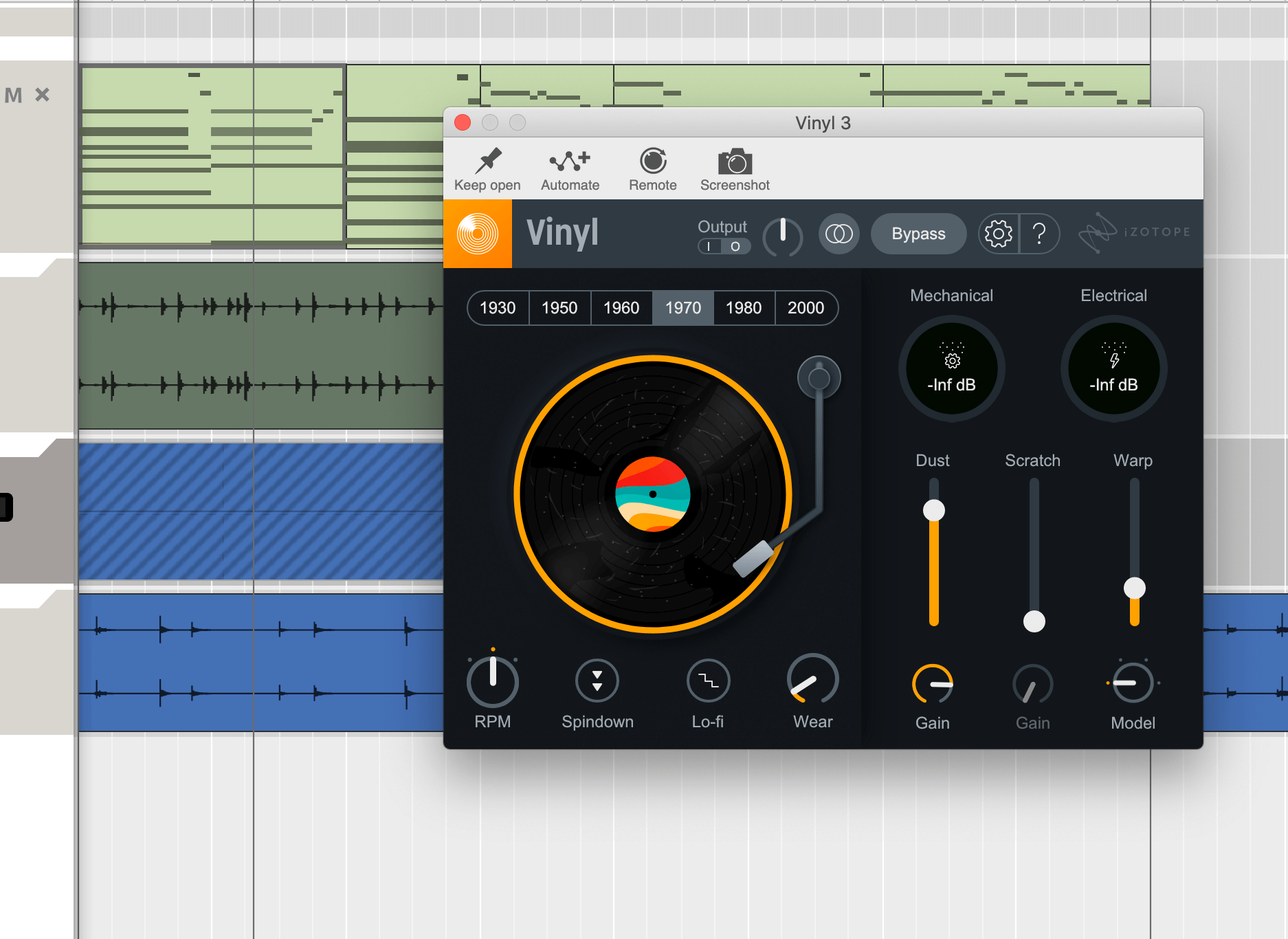 If necessary, load an instance of iZotope Vinyl onto the track, but reduce the Dust to zero, because we have a different plan. We load the same effect onto an empty audio track, turn Dust up to full and record the crackling over eight bars. We then use time stretch to double the length of the recording.