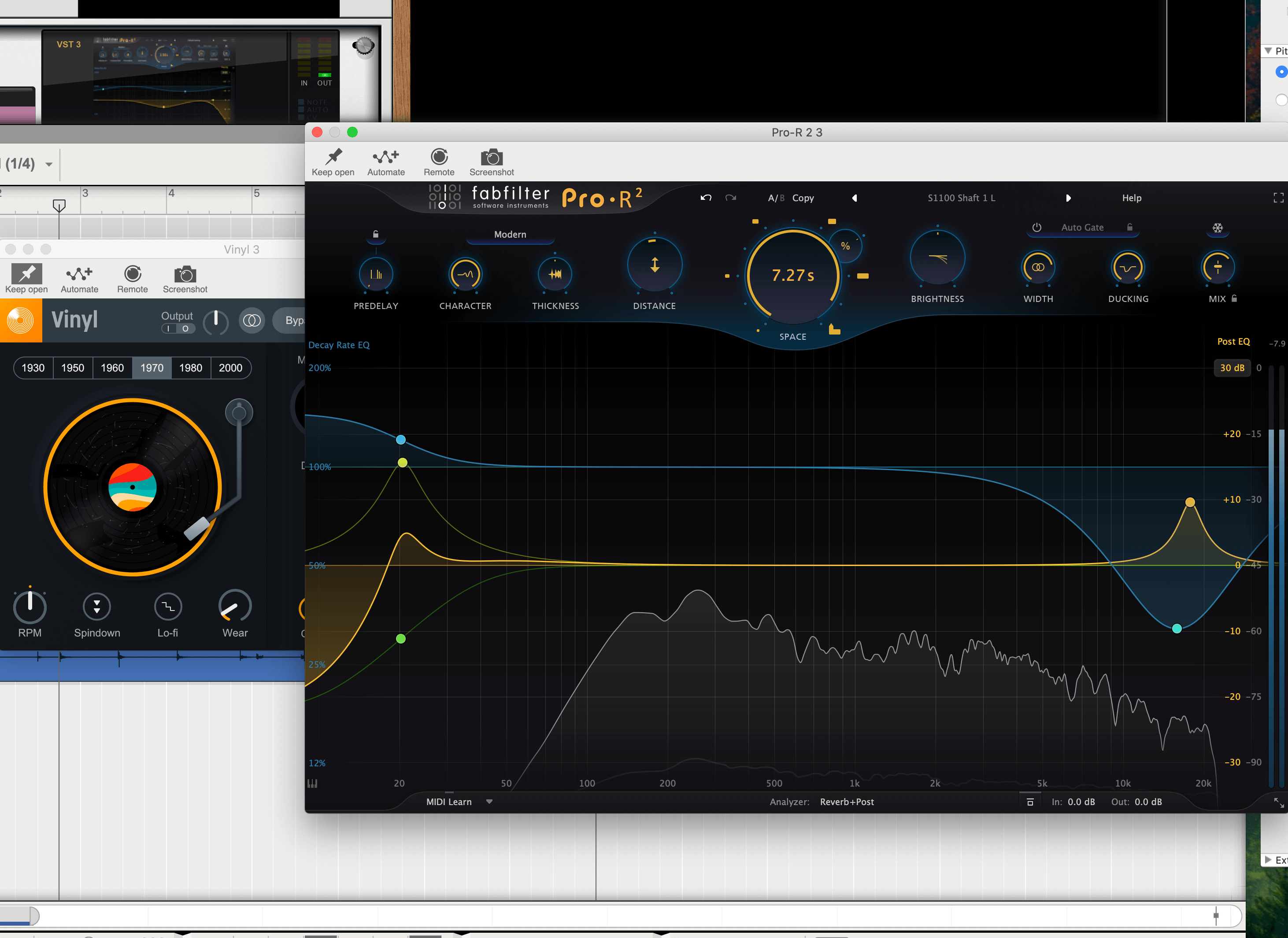 We load another FabFilter Pro-R 2 Reverb onto the track with the recording and import the Impulse Response S1100 Shaft. Here we turn up CHARACTER and DUCKING so that the reverb doesn't sound so static on the one hand and the crackling still comes through on the other. We subtly mix in the result to create an enormous amount of width in the overall mix.