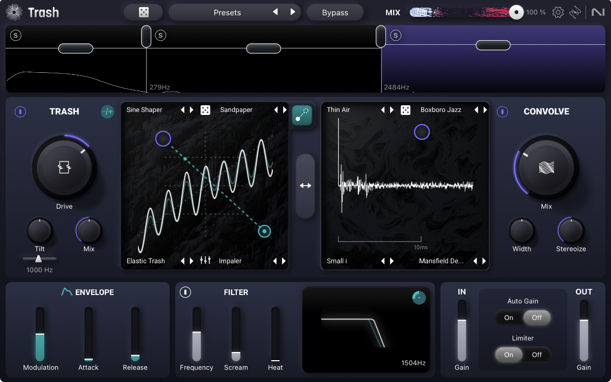 If that's not enough, you can also import your own impulse responses. To crossfade between four distortion algorithms, the Trash module, including its XY pad, now offers over 60 distortion types to choose from. The swap function can be used to vary the order of convolve and trash. The distortion can also be split into three individual frequency ranges. The self-oscillating scream filter has been integrated for authentic scream effects. Thanks to the envelope generator, the scream and trash module can also be modulated.