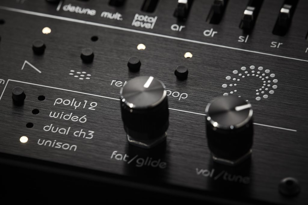 Dual ch3 takes advantage of a special feature of the chip. In this mode, you set the frequencies of the Operators freely and not in relation to each other. This leads to very weird, disharmonic results and is especially interesting for percussion and effect sounds. Unison layering of all 12 voices to a monophonic sound, which can be tuned to a mega-wide chord with the Fat control, is perfect for cinematic trailers. As a secondary function, the slider can be used to adjust glide (i.e. the smooth gliding from one pitch to the next).