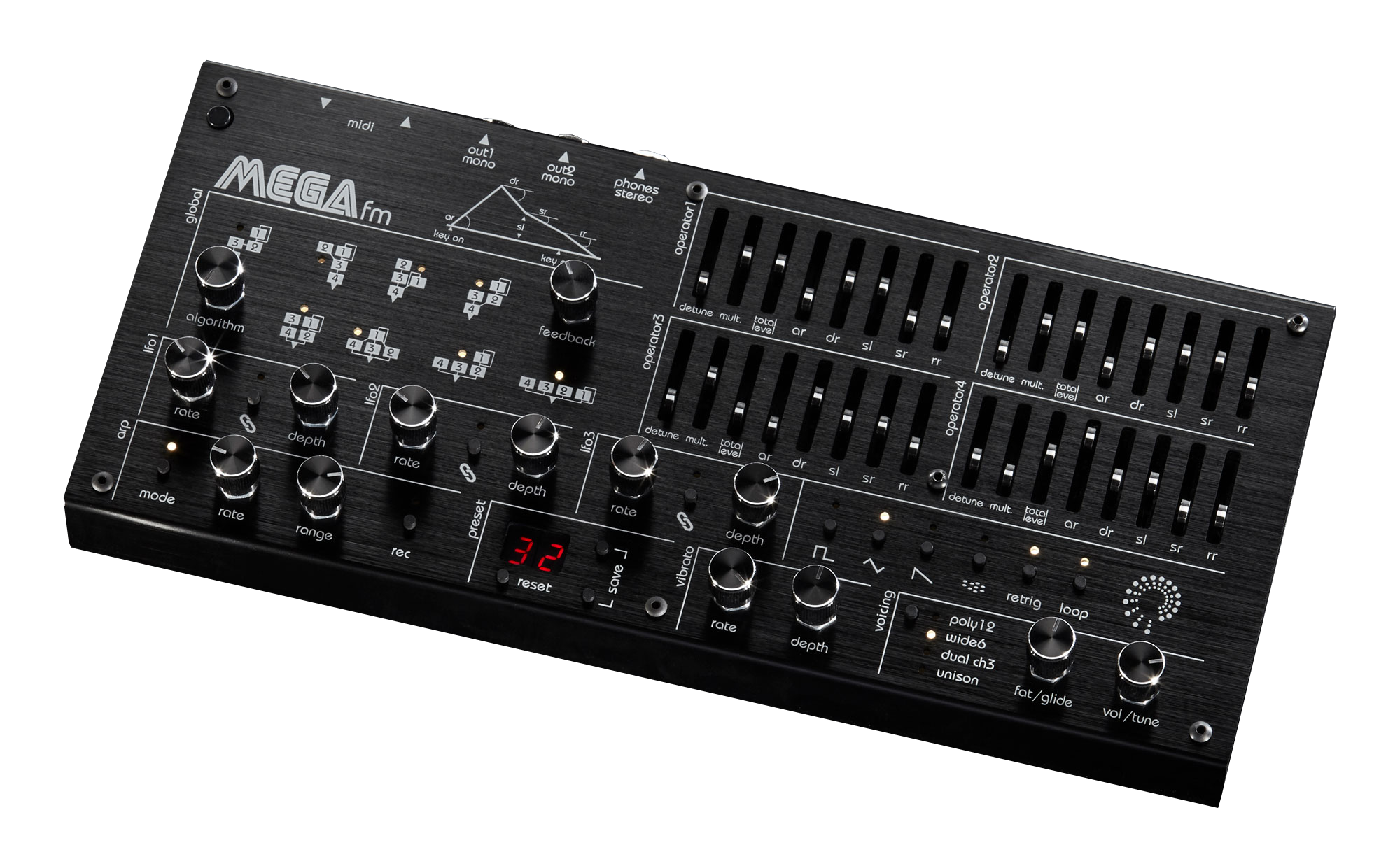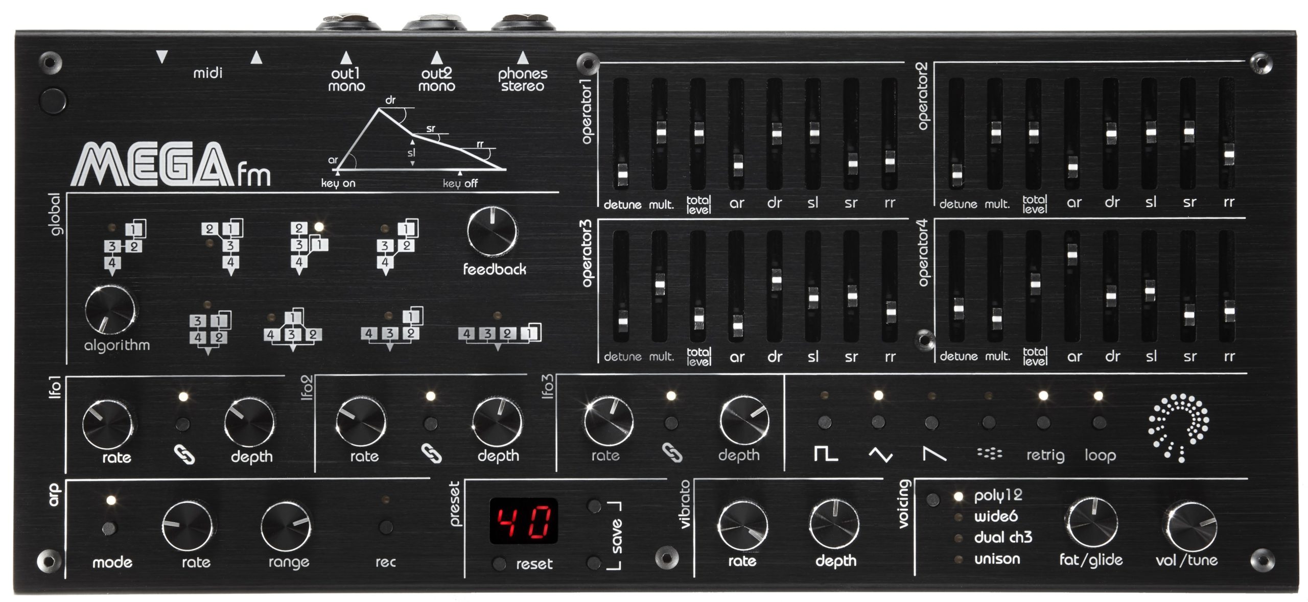 In the upper left corner of MEGAfm, you can choose from the eight available algorithms. Like almost everything else in the MEGAfm, this is done without detours and with a dedicated controller. All algorithms are printed in large letters on the case and have their own LED, so you can immediately see which algorithm is currently selected. With another potentiometer, you can control the feedback (i.e. the strength with which Operator 1 is frequency modulated with itself ).