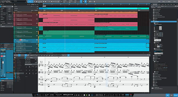 Studio One 5 has some important features for composers, too. The biggest arranging feature is the Score Editor. Before version 5, composers had to use another product for traditional notation – like PreSonus’ Notion or Sibelius or one of many others available. With the Score Editor, you can see multiple tracks of notes simultaneously in standard notation. There are a few notation tools available including notes, rests, recor- ding modes and actions. The Action Menu allows you to transpose, switch staff (from upper to lower staff and vice versa), fill with rests, and make tuplets.