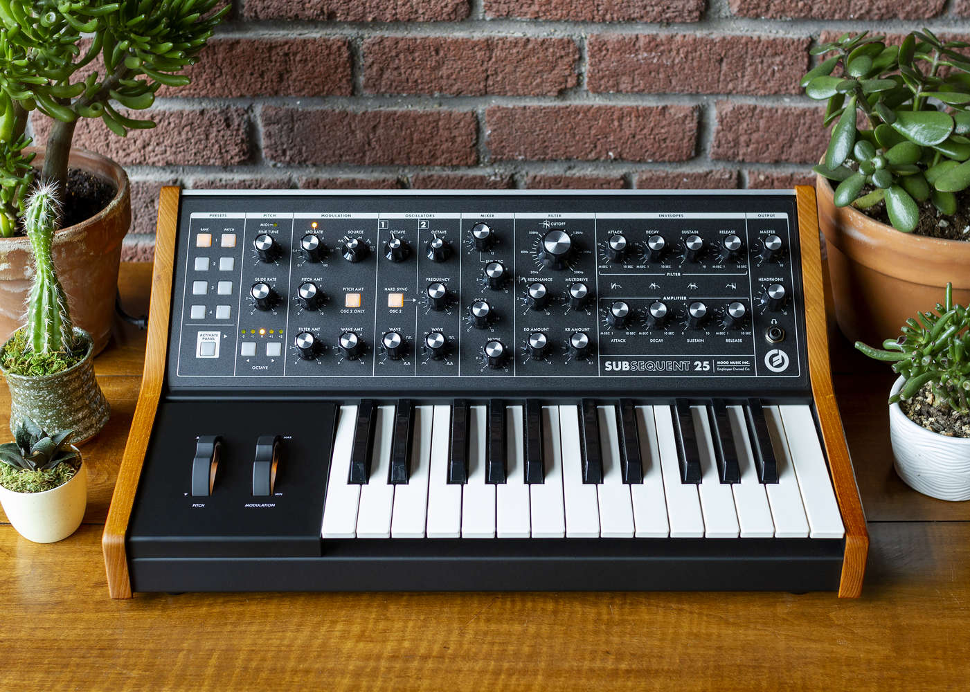 .The Subsequent 25 is a scaled-down version of the popular Subsequent 37 duophonic analog synthesizer and also the successor to the Moog Sub Phatty. Fittingly, the Subsequent 37 presents itself as a mixture of the two synthesizers. Format, controls and their arrangement correspond to the Sub Phatty, but with the black metal housing with wooden sides and the slanted control surface with knobs in the classic Moog design, the Subsequent 25 also looks like a Subsequent 37 shrunk in width.