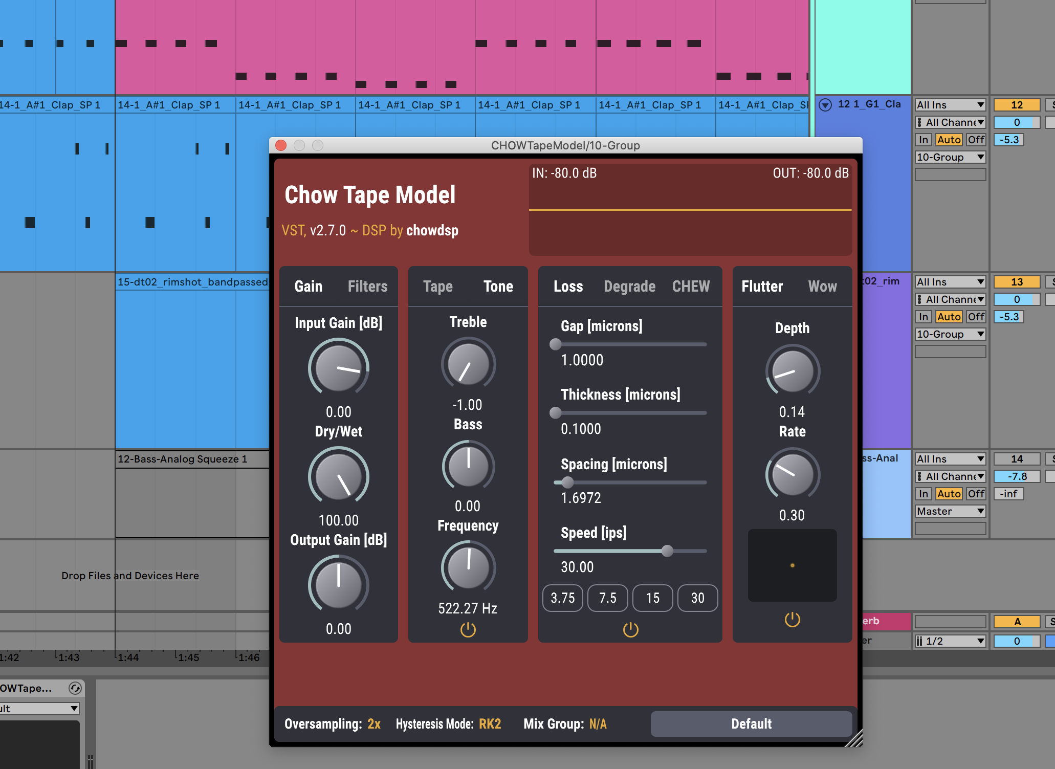 We load an EQ that works as a low pass around 5 kHz and makes the sound duller. This is followed by the Chow Tape Model Freeware. With bias and saturation at 2 o‘clock and drive at 3 o‘clock, we add a lot of distortion and pressure. In the tone section, we also set the treble to -1.00, so that the treble is also reduced here.