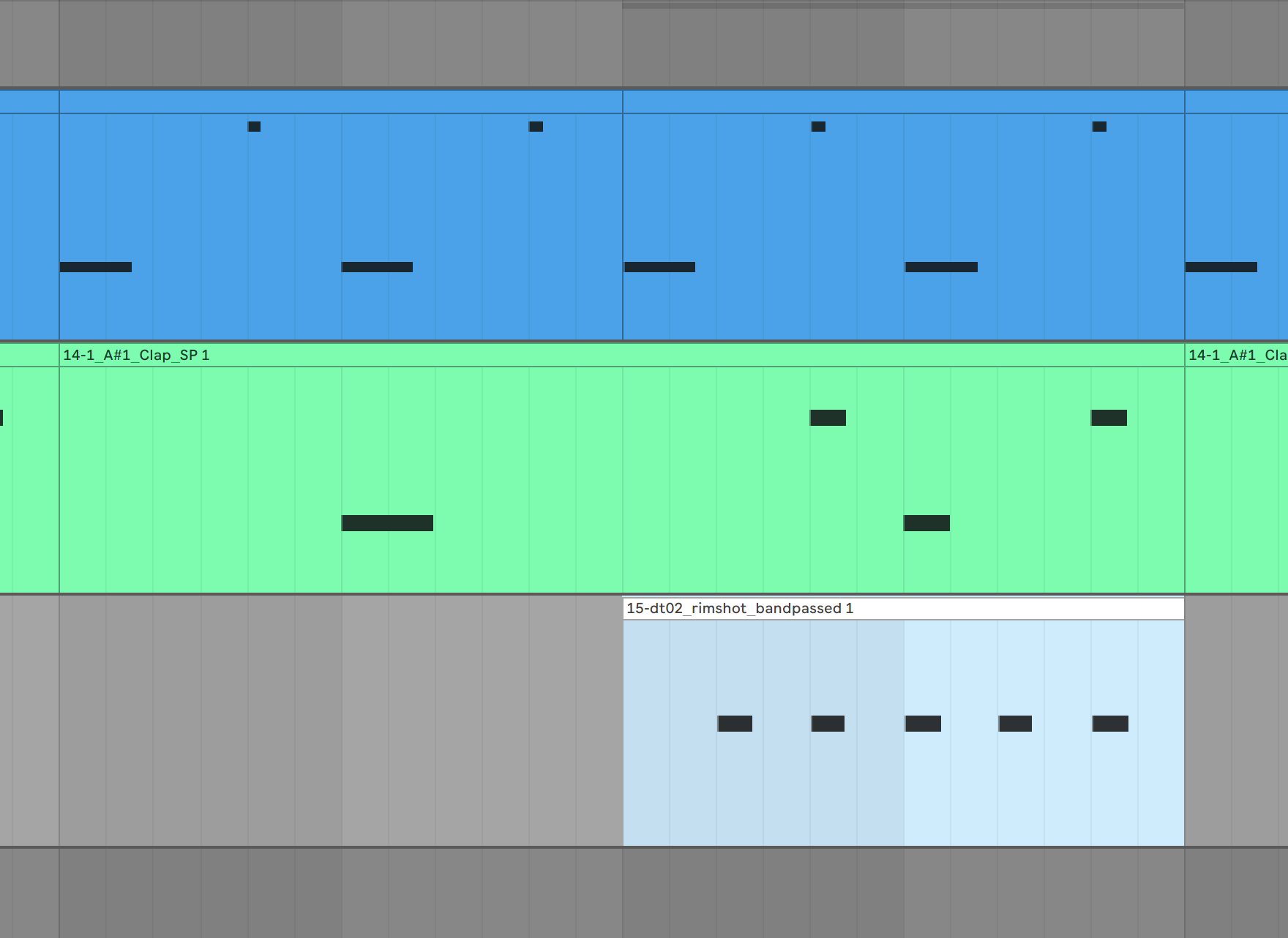 In addition to the kick, there is a clearly perceptible kind of clap, reminiscent of a knocking on wood. Likewise, there is a rimshot replacement every two bars as well as a dull clacking as a groove element between the kicks. The latter, however, creates an extreme stereo width, as the sound on the right side is delayed by around 10 ms.