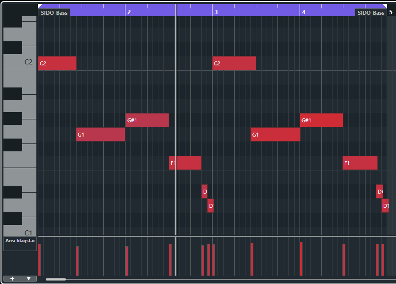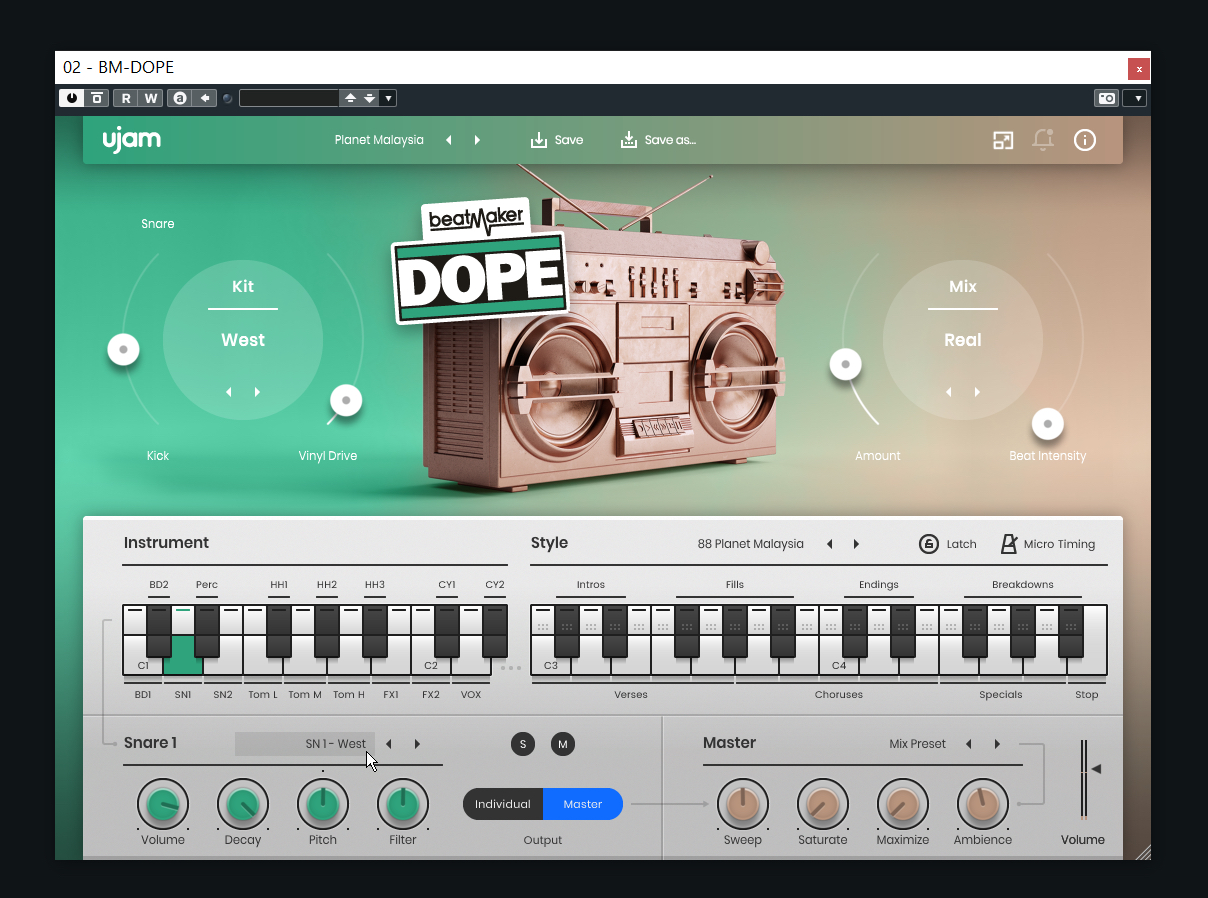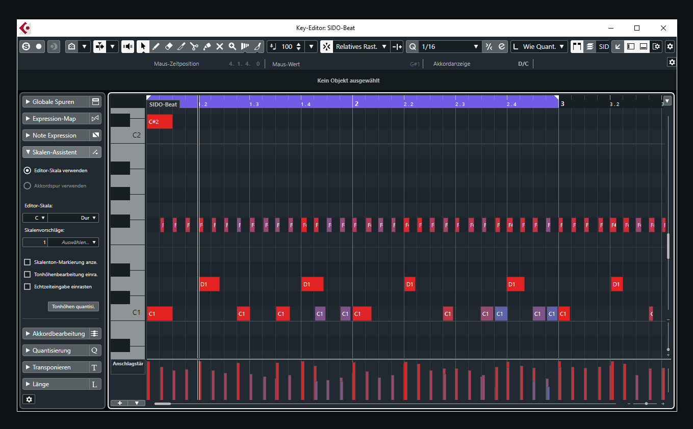Sido‘s hit „High“ (feat. Samra & Kool Savas) has a moderate tempo of 87 BPM. For the drums we use the kit „Planet Malaysia“ of the plug-in UJAM Beatmaker Dope . We replace the first snare of the drum kit with the sound „SN 1-West“. For programming the kick drum, we first set a sixteenth note grid.
