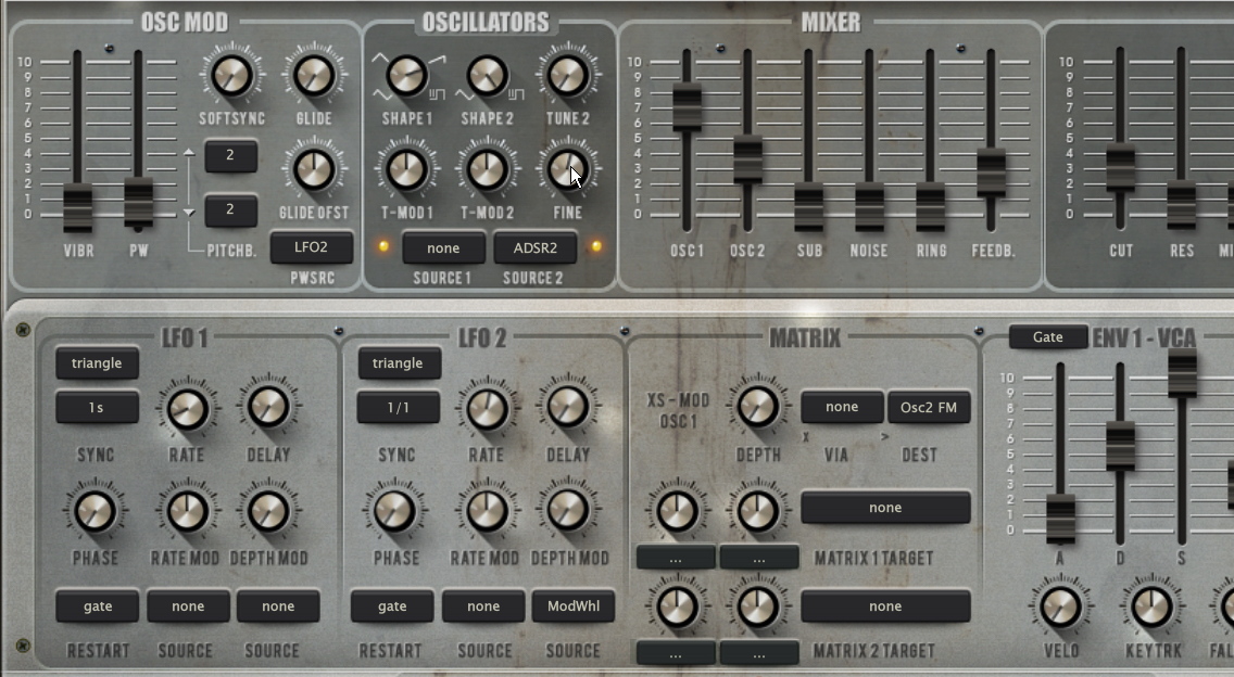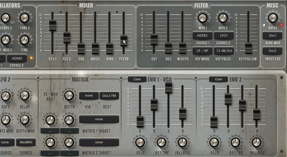 For more life, add a slight pulse width modulation. To do this, increase PW in the Osc Mod section to 2.0 and adjust the parameters of the two LFOs as shown in the previous picture. Then we adjust the levels in the mixer as shown. The feedback value of -71.00 ensures a slight saturation. The sound is still far too rich in overtones.