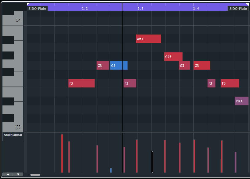 We recreate this with the Kontakt instrument „Shakuhachi“ from NI Komplete Start . The flute plays the lick shown with tied notes in the second half. To emulate the ornamentation of the first note, we trigger a corresponding sample with the D#0 key switch. Now all that‘s missing is a good pinch of reverb to make the flute blend into the mix.