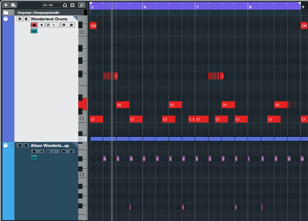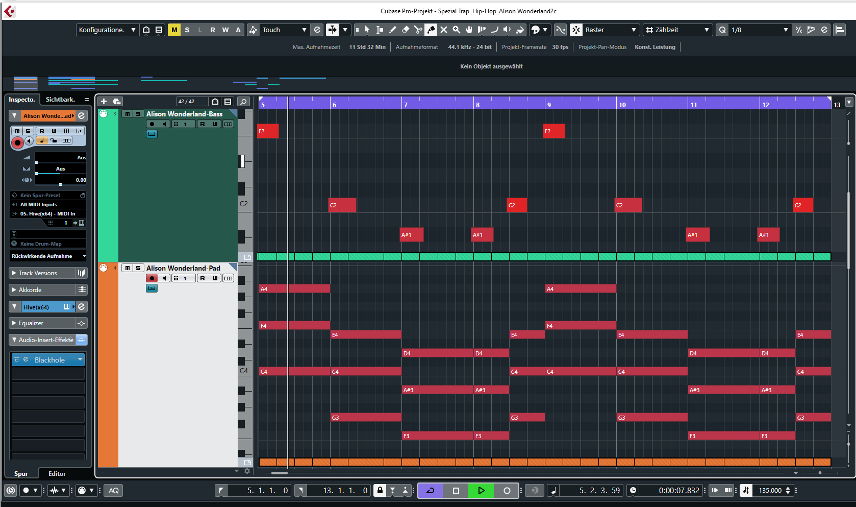 The filter and envelope parameters must be adjusted as shown. The bass gets an even livelier sound and more depth by using Tyrell‘s Unison effect as well as a reverb effect. The bass plays the notes F2, C2, A # 1, A # 1, C2 as shown. Now you can load a simple pad sound that contributes the chords F major, C major, B major and C major.