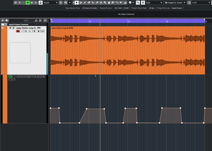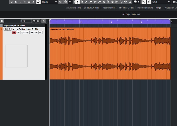 First open a new project with a tempo of 86 BPM. Load the enclosed wave file Jazzy Guitar Loop 86 BPM into the project on Bar 1. This will automatically create a stereo audio track. Then, select the four bars of the audio event in the locator area and then activate the loop function.