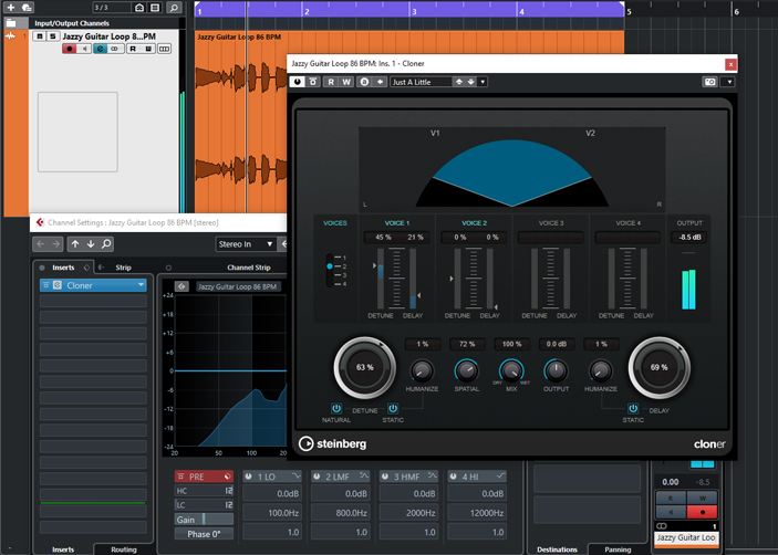 Open the channel settings of the guitar track and load the audio effect Cloner to the first insert slot. Load the Just a Little preset and set the Mix slider to 100% to pull the mono guitar signal into the stereo width. The stereo effect is created by a short time offset between the left and right sides.