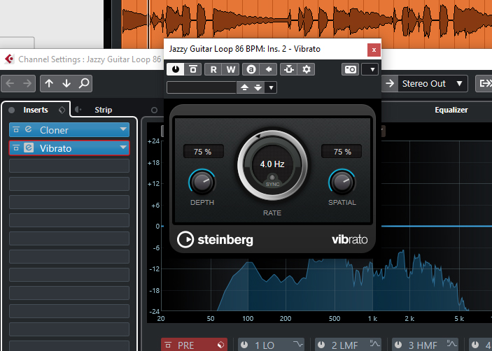 Then load the Vibrato plug-in into the second insert slot, deactivate the Sync function and set the Rate value to 4 Hz. With the vibrato, we want to set the decay of the longer held notes in motion in the following two steps to create a slightly wobbling sound of the guitar.