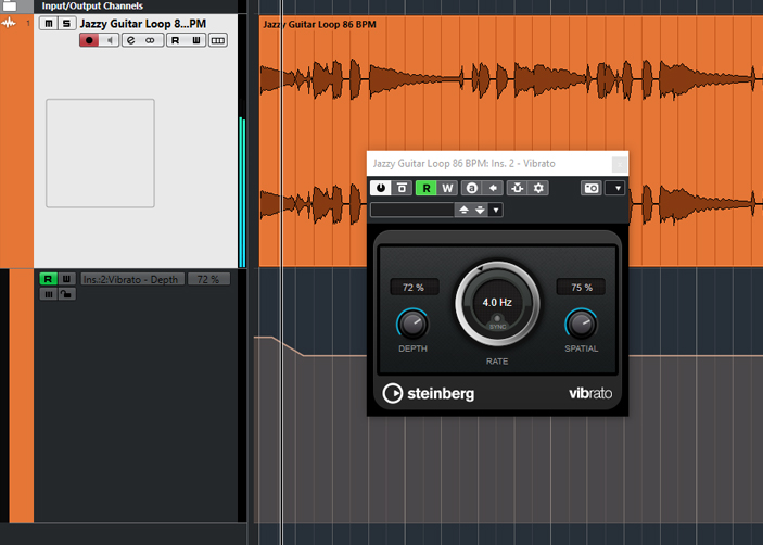 Draw the automation of the Depth control in such a way that only the decay of all long held notes of the guitar track with about 30% Depth can be heard. Make sure to draw the Depth value with a gentle increase or decrease. The vibrato effect will not be heard on the faster played guitar notes.
