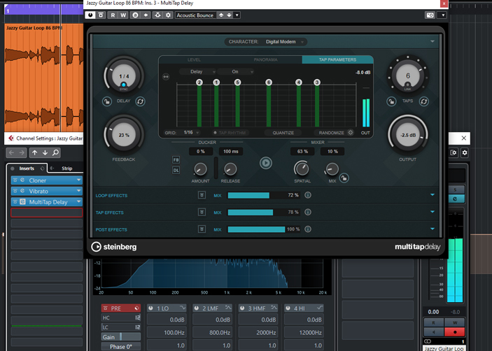 As a last step, load the MultiTap Delay into the third insert slot of the track and open the Acoustic Bounce preset. Then set the Mix control to 10%. This combined effect of reverb and delay adds an interesting spatial ambience to the signal and creates more depth in the sound.