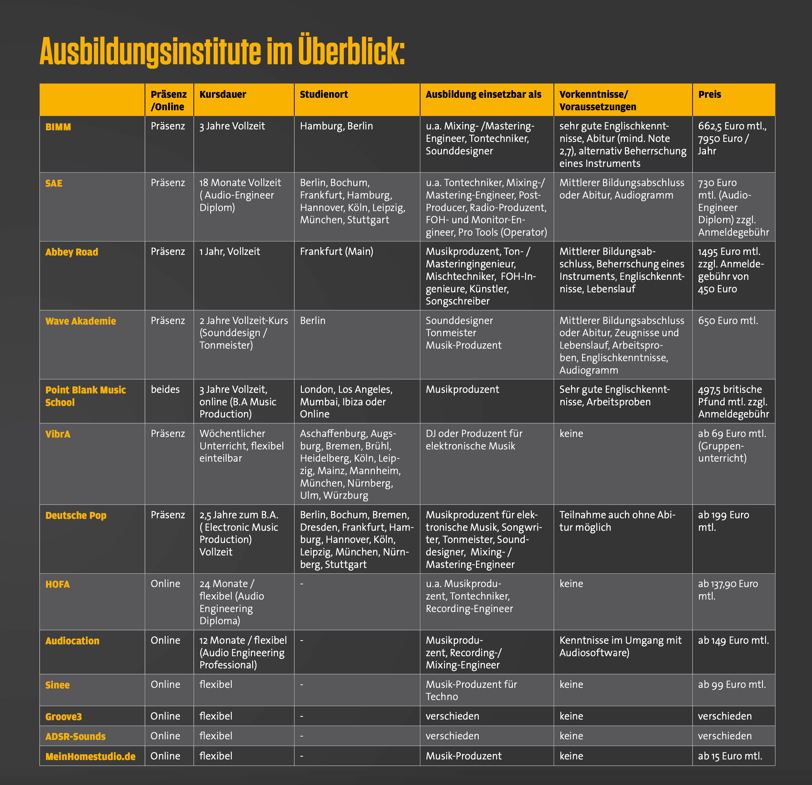 As the world‘s largest media campus and with more than 40 years of experience, the SAE Institute trains new audio engineers with its course. With a combination of theoretical teaching components and 75% practical experience, the students at the nine German locations acquire all the important basics for future work in the sound/film studio, radio or as a live technician. Among other things, the teaching content includes electrical engineering, microphones, effects studies, acoustics, loudspeakers, as well as recording, mixing and production techniques on the hi-end consoles from Neve or SSL in their own practice studios. Electronic music production and DAW are also part of the course. The monthly fee for the 18-month course is 730 Euros. After attaining the audio engineering diploma, studies can be continued for a further one or two years until the state-recognized Bachelor/Master degree. By the way: Starting in the coming winter semester, the institute will also be opening up international courses.