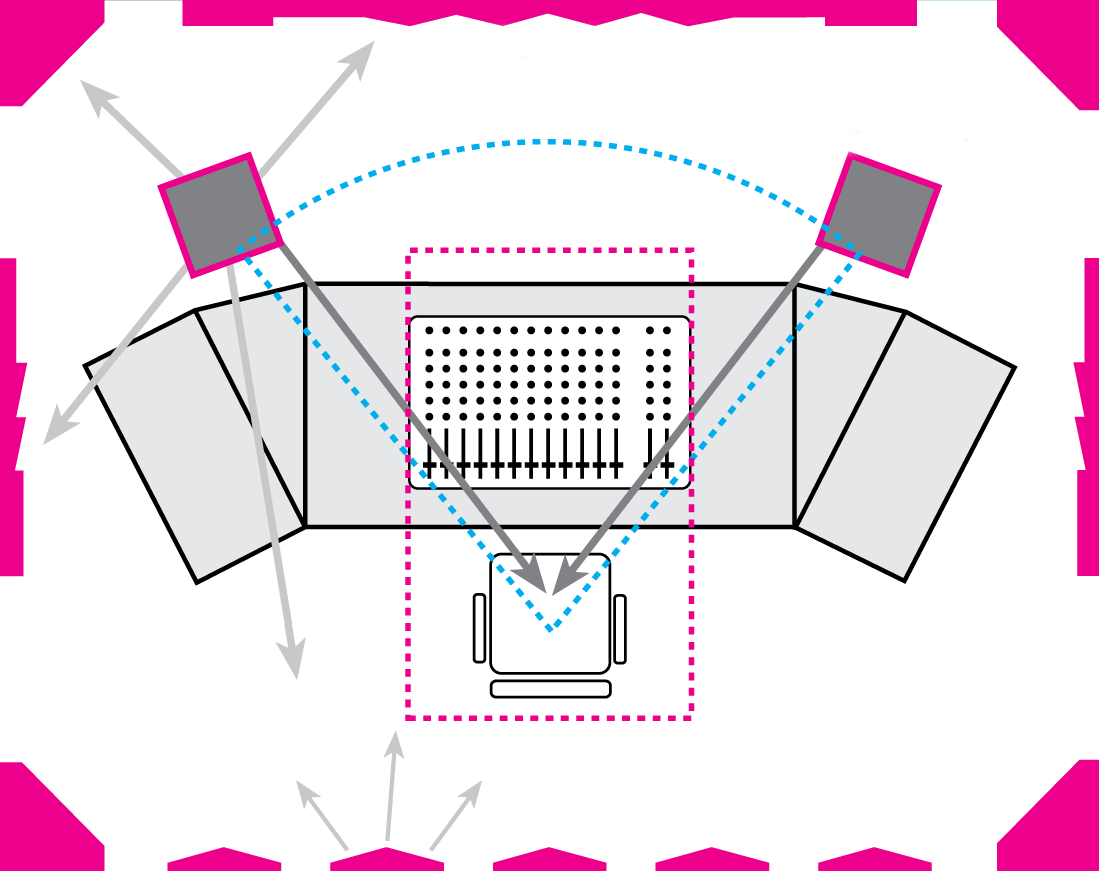 Windows are always the least problematic behind the speakers. With most speakers, only low frequencies, at most lower mids, radiate behind the speaker. These penetrate through glass. If there are windows on the side walls and these fall within the range of the early reflections, it makes sense to use free-standing modules called gobos here. If the window is further back in the room, it is often possible to equip only the wall opposite with modules. Windows on the back wall should ideally be avoided.