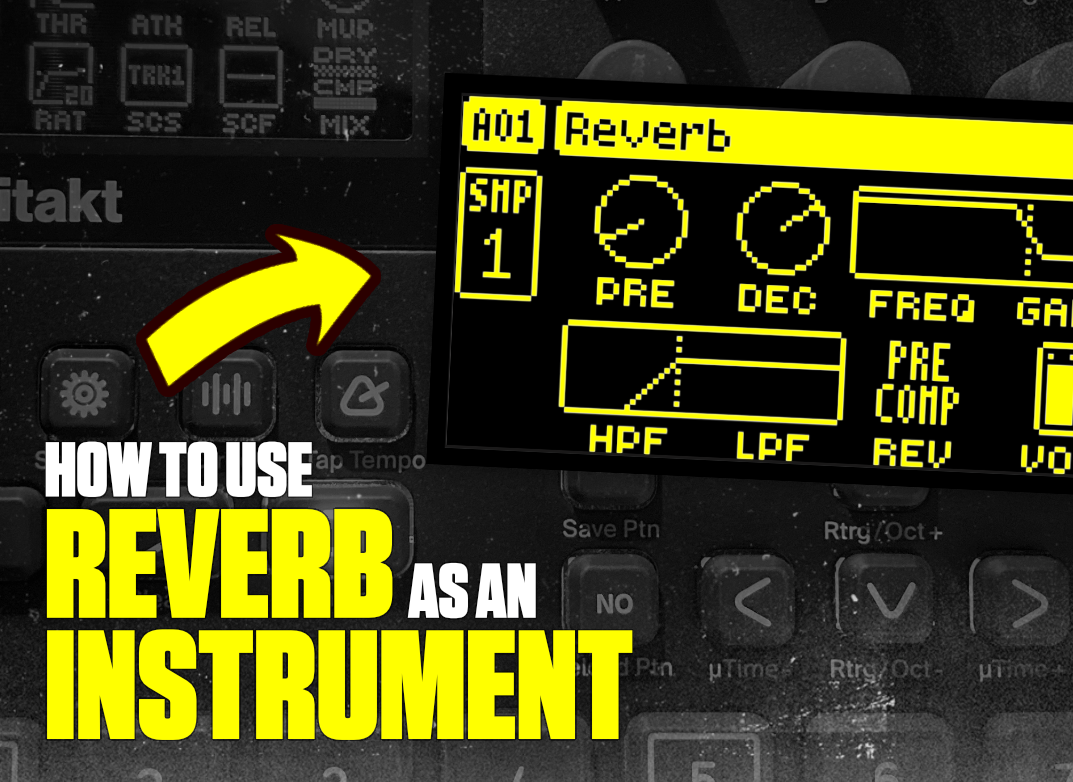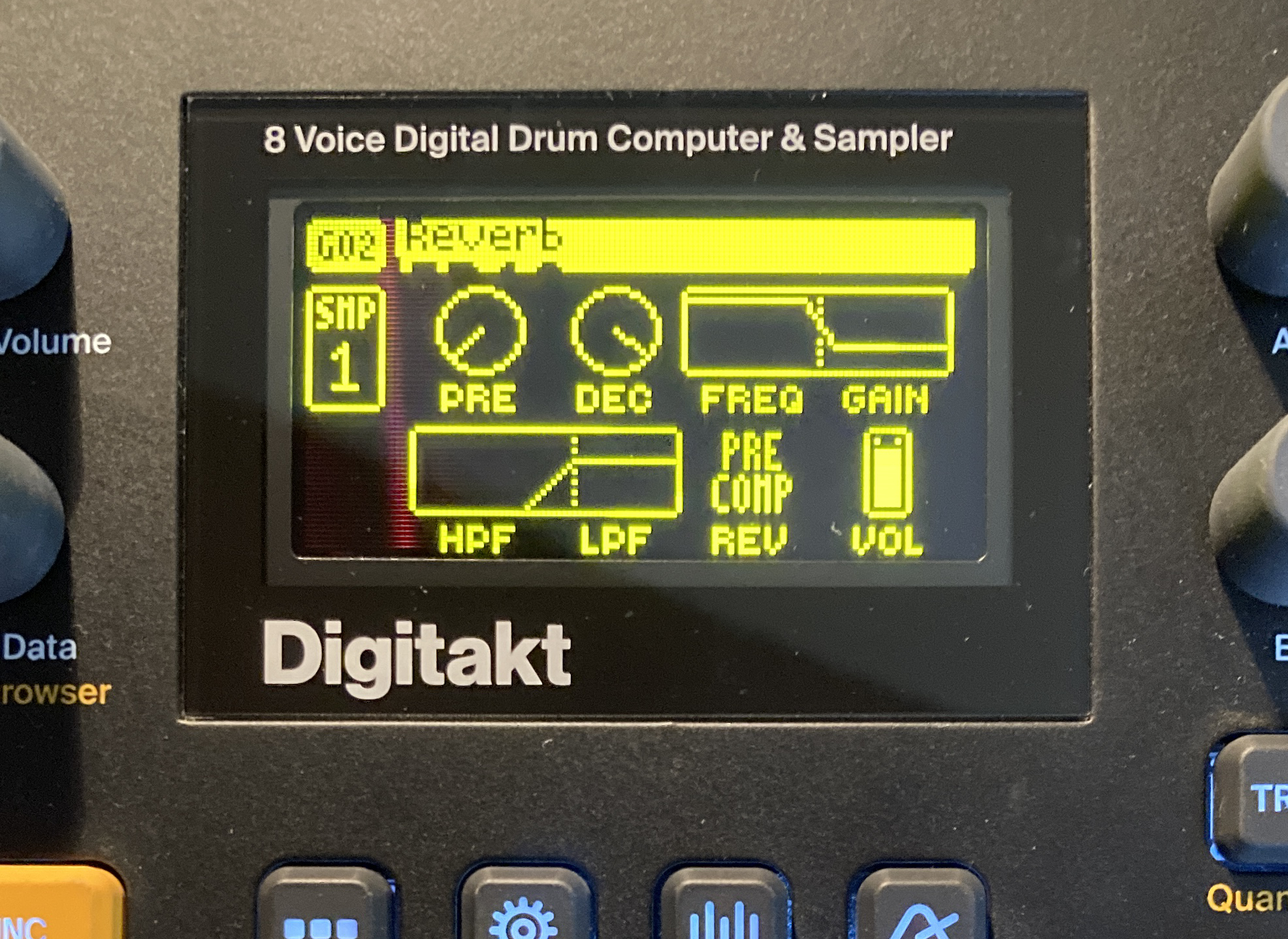 FUNC+AMP then takes us to the reverb section, where we stretch its reverberation time to max with DEC(ay). In order to prevent the result from sounding totally bassy and/or tinny, we turn up the highpass filter (HPF) to about halfway. Since we want to create intentionally massive textures, we leave the lowpass filter (LPF) untouched.