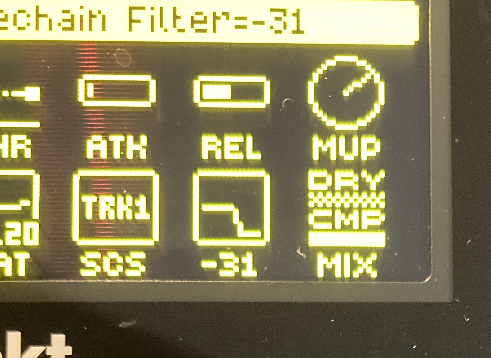 This is because with POST COMP, the reverb bypasses the compressor and, therefore, does not react to the sidechain. Then, we switch to the master section via FUNC+LFO. There, we turn MIX to full CMP and select the track with the kick at SCS (Side Change Source) – in our case TRK1. We don‘t need the side chain filter (SCF) now.