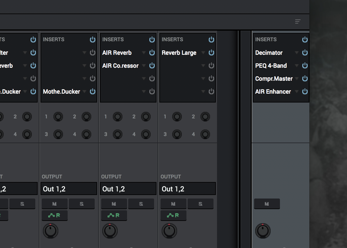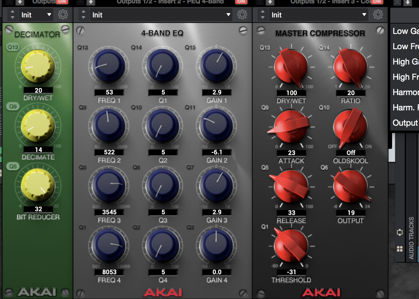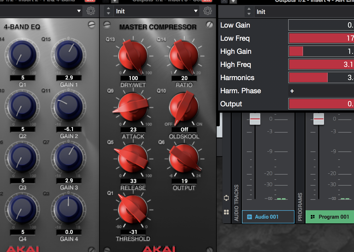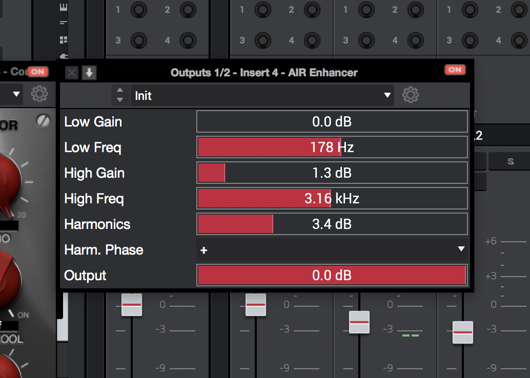 Here you should load your own plug-in because, in our experience, AIR Maximizer is too harsh for this purpose. Since we want to work standalone and thanks to the heavy compressor settings, there are no unwanted peaks; so we load the AIR Enhancer instead and add a touch of highs with High Gain at 1.3 dB and Harmonics at 3.4 dB.