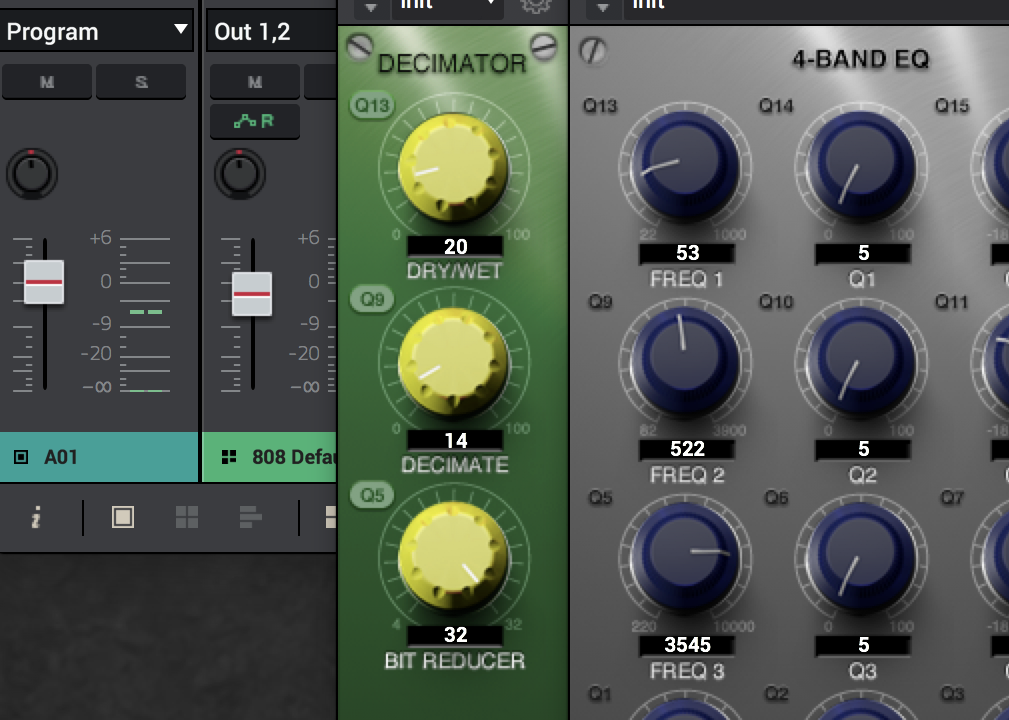 We don‘t really need an effect for the first slot on this track. However, if you want more punch for your sounds, load the DECIMATOR, set DECIMATE to 12 or more and mix the effect with DRY/WET set to 20 - 30%. The result will sound much punchier. If in doubt: less is more.